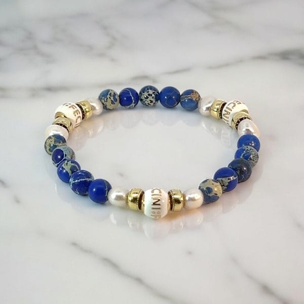 White freshwater pearls are renowned for their timeless elegance and purity, symbolizing wisdom and serenity. Blue imperial jasper stones are known for their beautiful patterns and calming blue hues, believed to bring peace and balance to the wearer. Together, they create a stunning combination of natural beauty and sophistication.