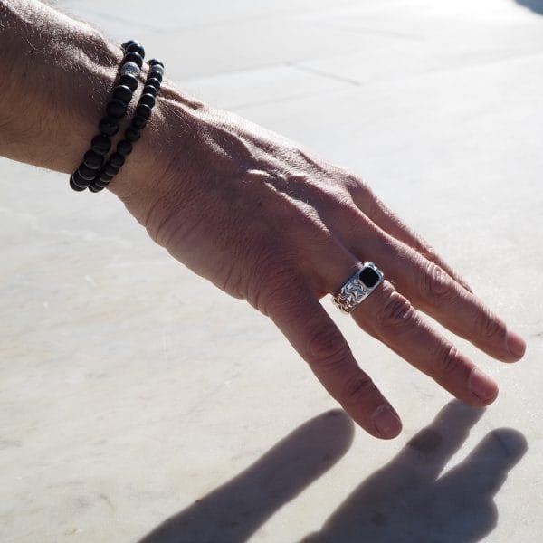 Crafted from high-quality 925 sterling silver, this ring boasts a custom-cut black onyx stone, exuding strength and confidence. The rhodium plating adds a touch of luxury, enhancing both durability and shine. Lift your look with this striking piece, a perfect fusion of contemporary design and timeless elegance.