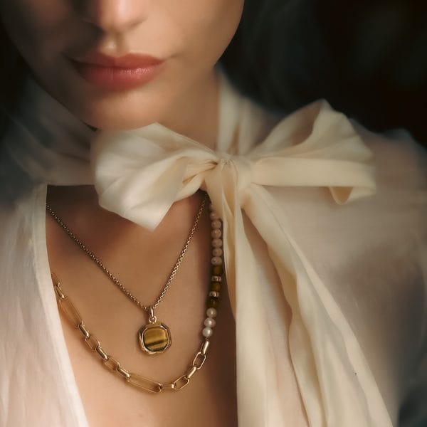 This striking necklace features a custom-cut, octagon-shaped Tiger Eye stone, celebrated for its captivating golden and brown hues and the dynamic, shifting patterns that come alive under the light. Known for its properties of courage and clarity, Tiger Eye brings not just beauty but strength to those who wear it.