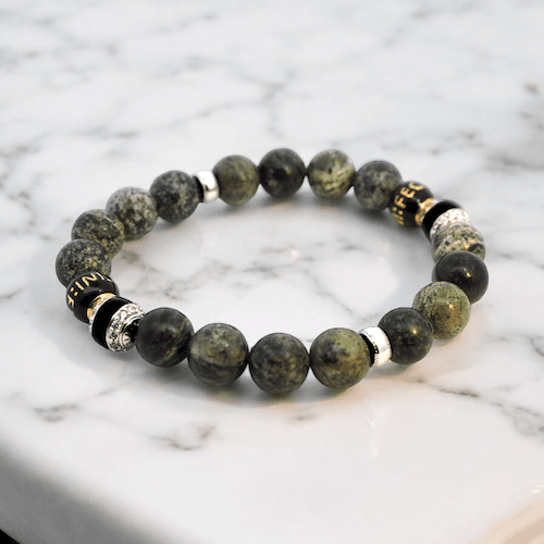 This stunning bracelet features 8mm green Zebra Jasper beads, celebrated for their grounding energy and distinctive patterns that evoke the harmony of nature.