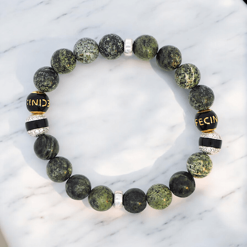 The bracelet is adorned with two silver beads, each embellished with black enamel, sparkling CZ stones, and white rhodium plating, adding a touch of elegance and modern flair. Additionally, it includes two 925 silver beads, intricately engraved with FECINI letters in black enamel and plated with 3-micron 18K gold, offering a refined and personalized touch.